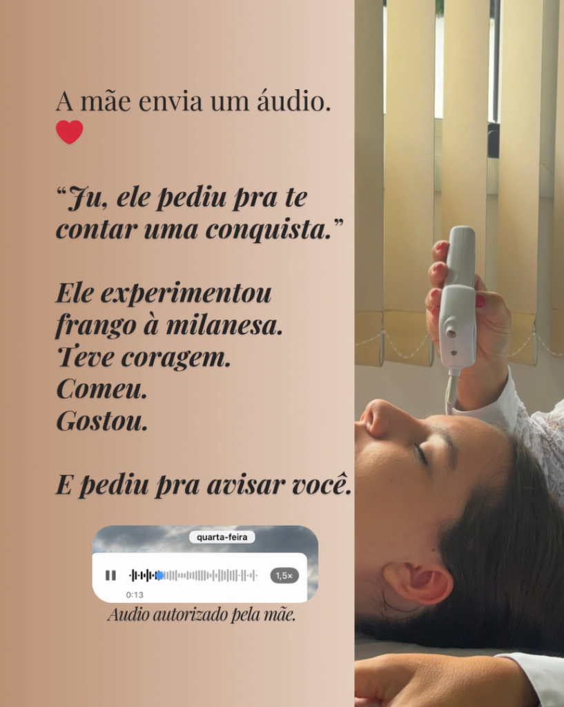 Oi Ju, boa tarde, tudo bem? Ju, passando pra mandar um recado do Matheus. Na verdade, ele pediu pra eu compartilhar com você uma conquista dele essa semana. Na segunda-feira à noite, o Maurício fez frango à milanesa, sabe? Enpanado. E aí ele experimentou, teve coragem de experimentar, experimentou, gostou e comeu. Aí ele falou: mamãe, conta pra tia Ju que eu comi uma coisa diferente. Aí eu falei: conto. Aí um dele perguntou: você falou pra tia Ju? E eu: ops, esqueci. Eu falei: mas eu vou falar pra ela então que você foi super corajoso, experimentou algo diferente e ainda gostou. Eu sempre falo pra ele, né? Importante é experimentar. Se você não gostar, não tem problema. A gente vai experimentando outras coisas, tá bom? Um beijo, Ju.